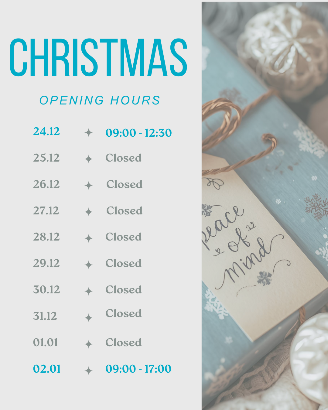 We will be closing at 12:30pm on Christmas Eve to allow our team to enjoy the celebrations with their families and friends. Our office will then reopen at 9:00am on 2nd January 2026, ready to assist you in the New Year.